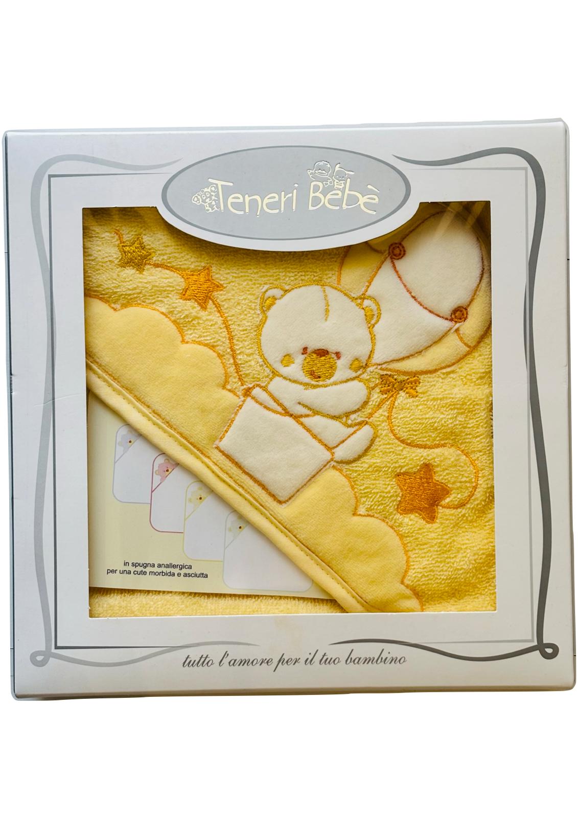 Descrizione: Accappatoio Neonato/a Triangolo in spugna anallergica colorata TENERI BEBE'. Disegno ricamato Mongolfiera. Misure: 75x75 cm. Art. 1917