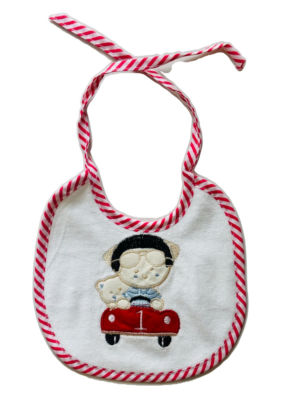 Descrizione: Bavaglino neonato in ciniglia ricamata con i laccetti, disegno orsetti e macchinina o elefantino.