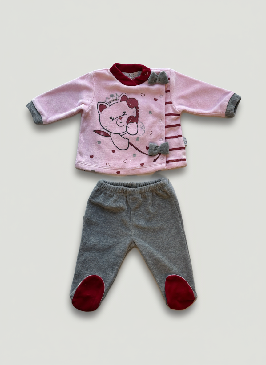 Descrizione: Completo nascita 2 pezzi in morbida ciniglia NAZARENO GABRIELLI, maglia rosa con stampa gattino al telefono, due fiocchi applicati grigio melange che richiamano il colore delle ghettine. Colletto e piedini in rosso. Comoda chiusura con bottoncini a pressione posizionata davanti lateralmente e lungo le gambe per facilitare il cambio.