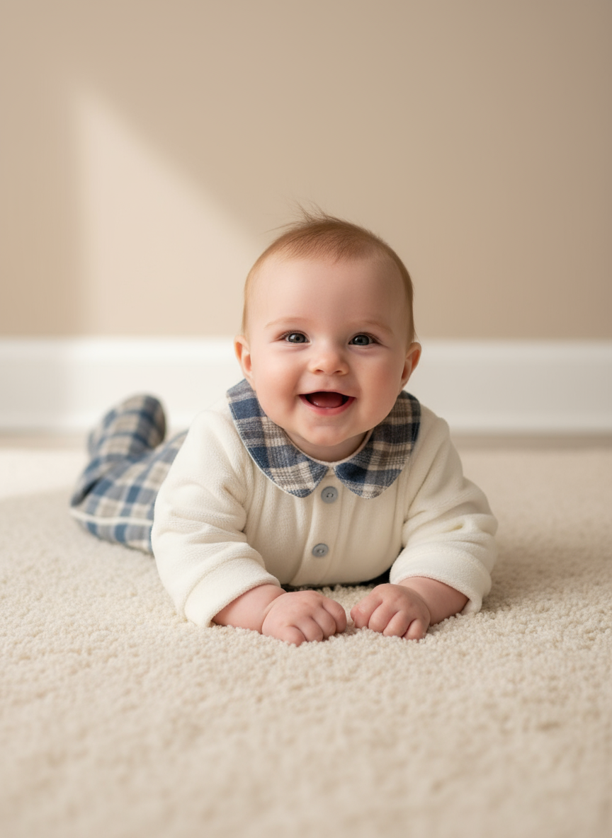 Descrizione: Completo 2 pezzi nascita in morbida ciniglia I BATUFFOLINI, maglia panna con colletto e applicazioni fantasia scozzese sull'azzurro e il grigio che richiamano le ghettine a quadri scozzesi.