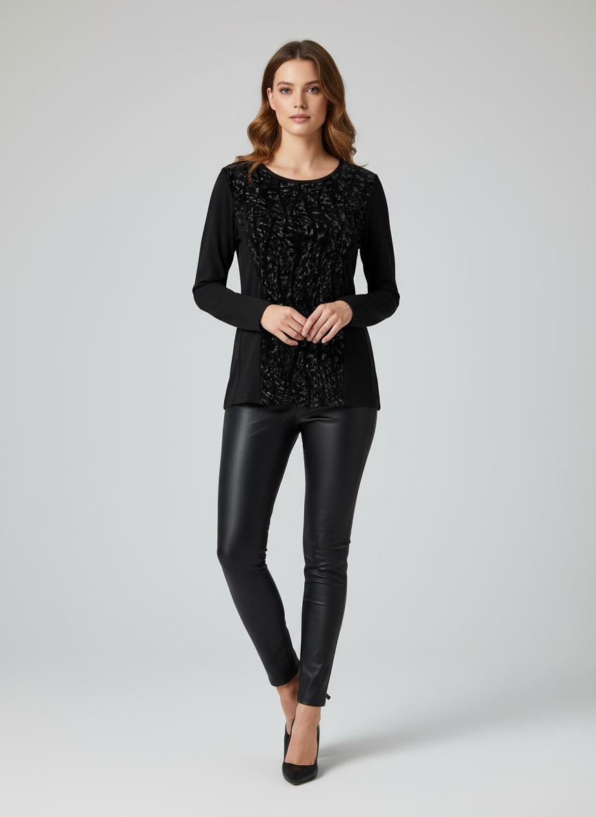 Il corpo è realizzato in cotone elasticizzato morbido e avvolgente, mentre la parte frontale si distingue per un raffinato inserto in ciniglia fantasia sui toni del grigio, dall’effetto luminoso e ricercato.