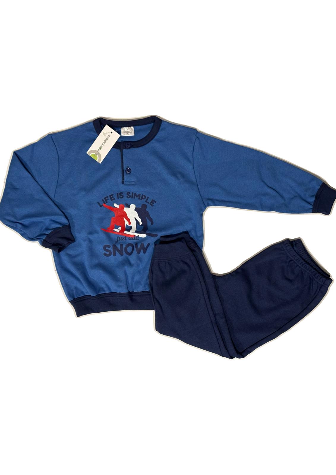 Descrizione: PPigiama Bambino manica lunga serafino in cotone interlock, composto da maglia con stampa disegno sul davanti, bottoncini sullo scollo e polsini; pantaloni con elastico in vita e polsini.