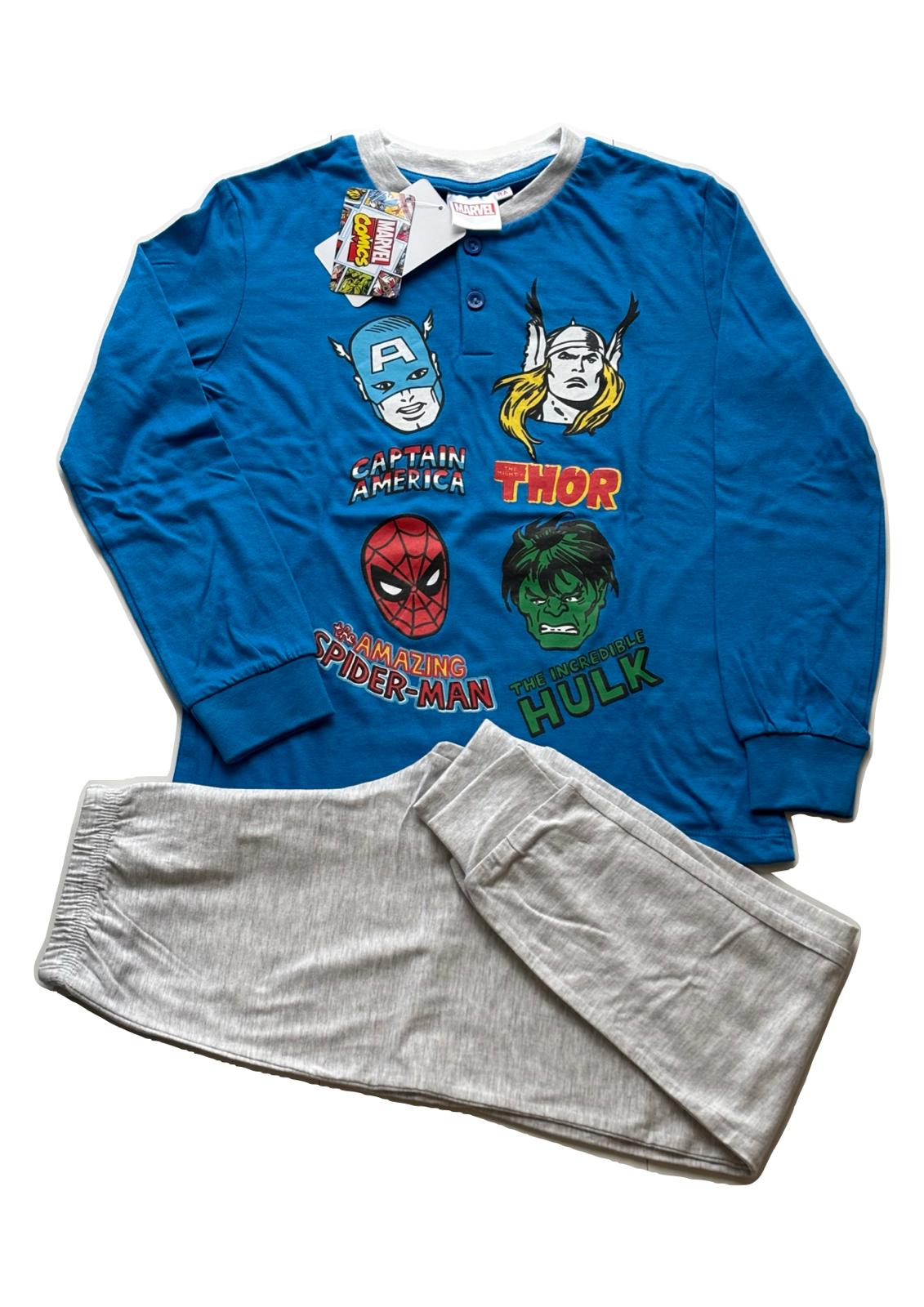 Descrizione: Pigiama bambino manica lunga serafino in Jersey di Cotone blu royal della linea Marvel Comics con stampa sul davanti dei personaggi Captain America, Thor, Spiderman e L'Incredibile Hulk, pantalone grigio melange con elastico in vita e polsini per garantire una vestibilità comoda. Realizzato in morbido cotone, delicato sulla pelle, offre il massimo comfort.