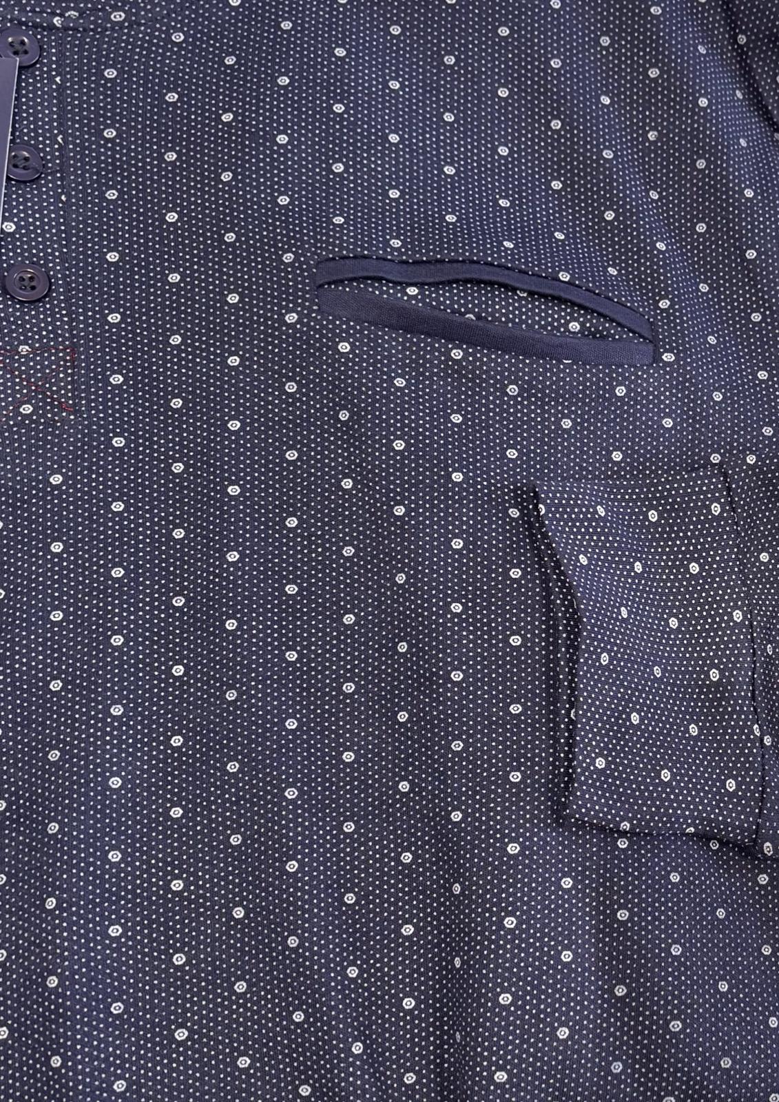 La maglia, di colore blu scuro, presenta un motivo micro-geometrico elegante tipico delle cravatte classiche: puntini bianchi intervallati da piccoli esagoni, per un effetto raffinato e maschile. Il modello è completato da un collo serafino a tre bottoni e da pantaloni lunghi tinta unita blu scuro con elastico in vita e polsini alla caviglia.