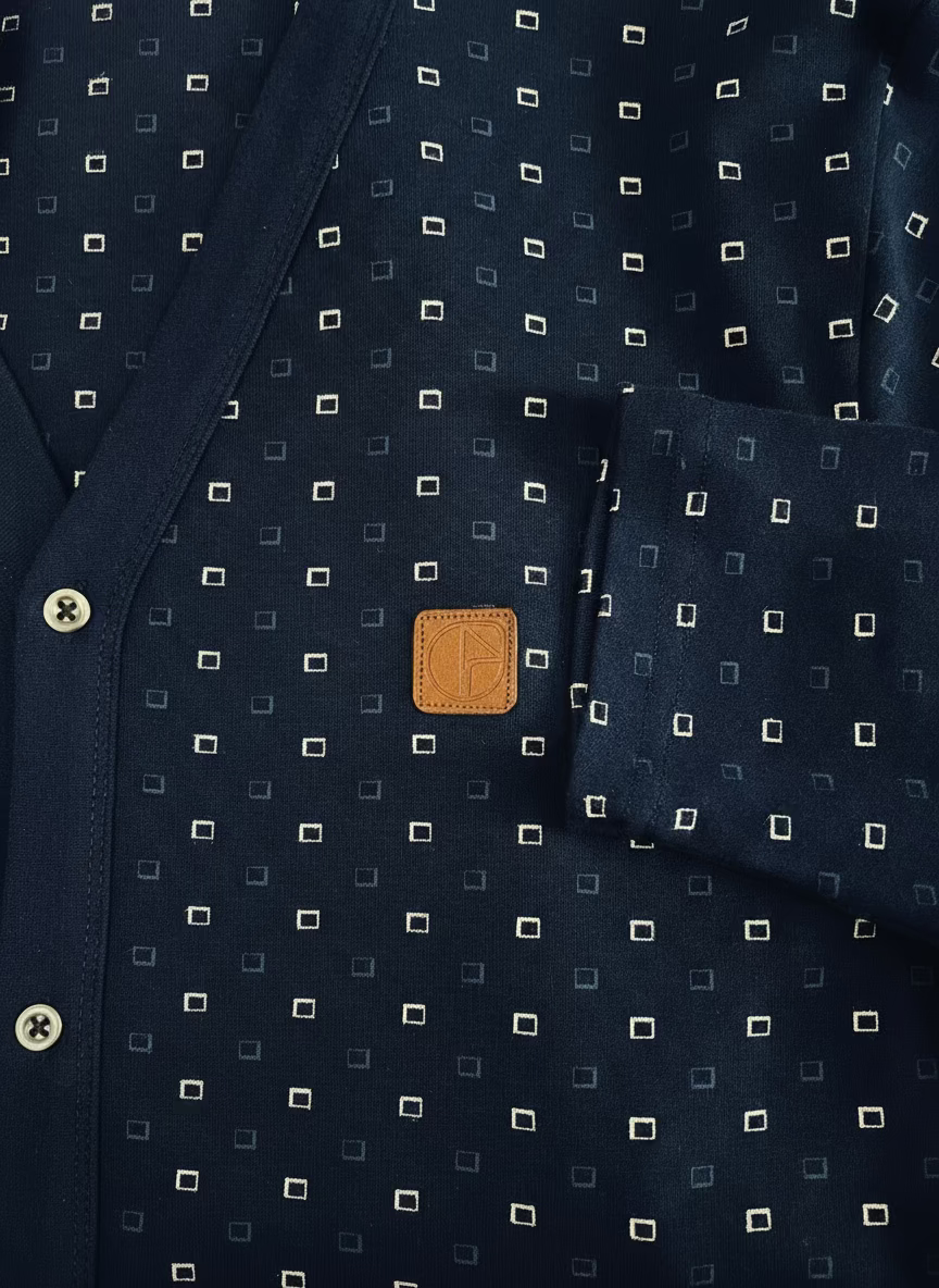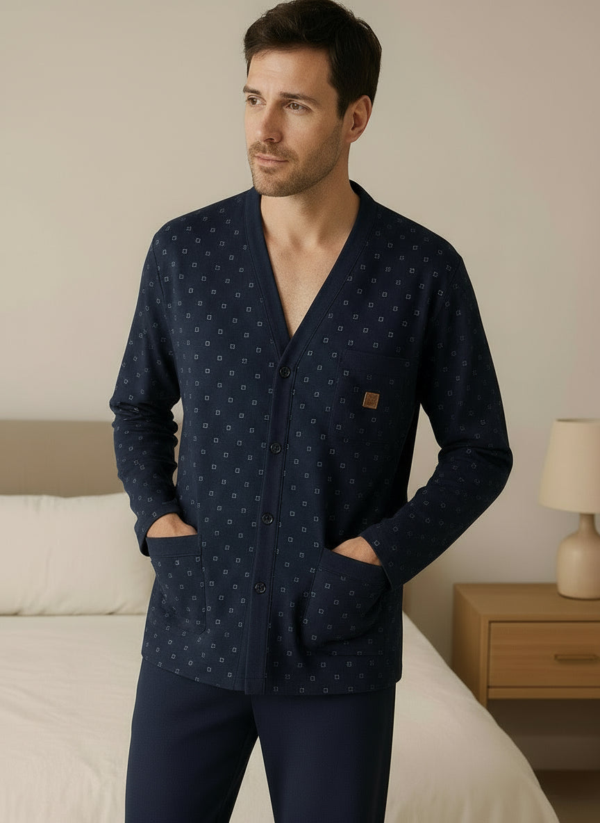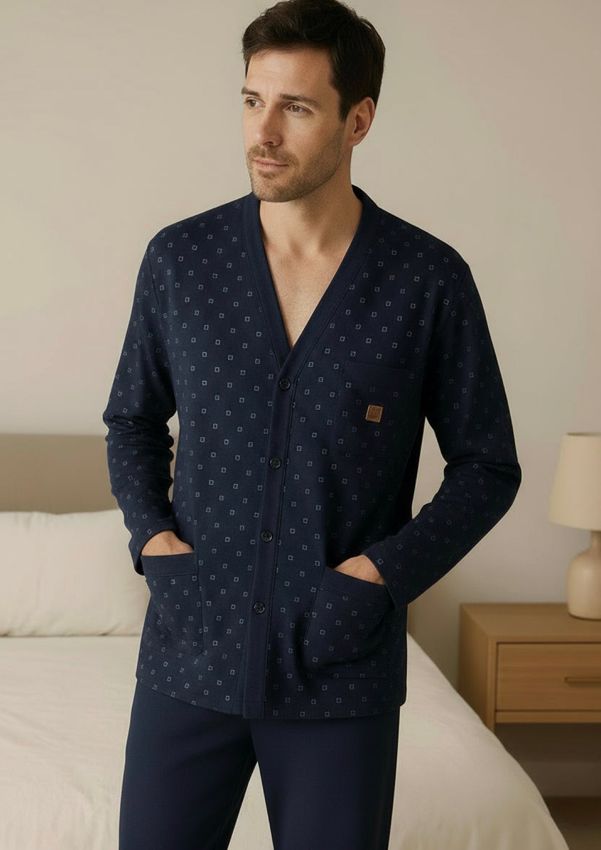 Descrizione: Pigiama uomo Nazareno Gabrielli in morbido interlock di cotone, perfetto per la stagione autunnale e invernale. Modello aperto con bottoni, caratterizzato da una raffinata fantasia geometrica a piccoli quadretti blu e bianchi su fondo blu navy. Il tessuto è caldo, liscio al tatto e garantisce il massimo comfort durante il riposo. Il logo in ecopelle tono cuoio sul petto aggiunge un tocco distintivo e curato.