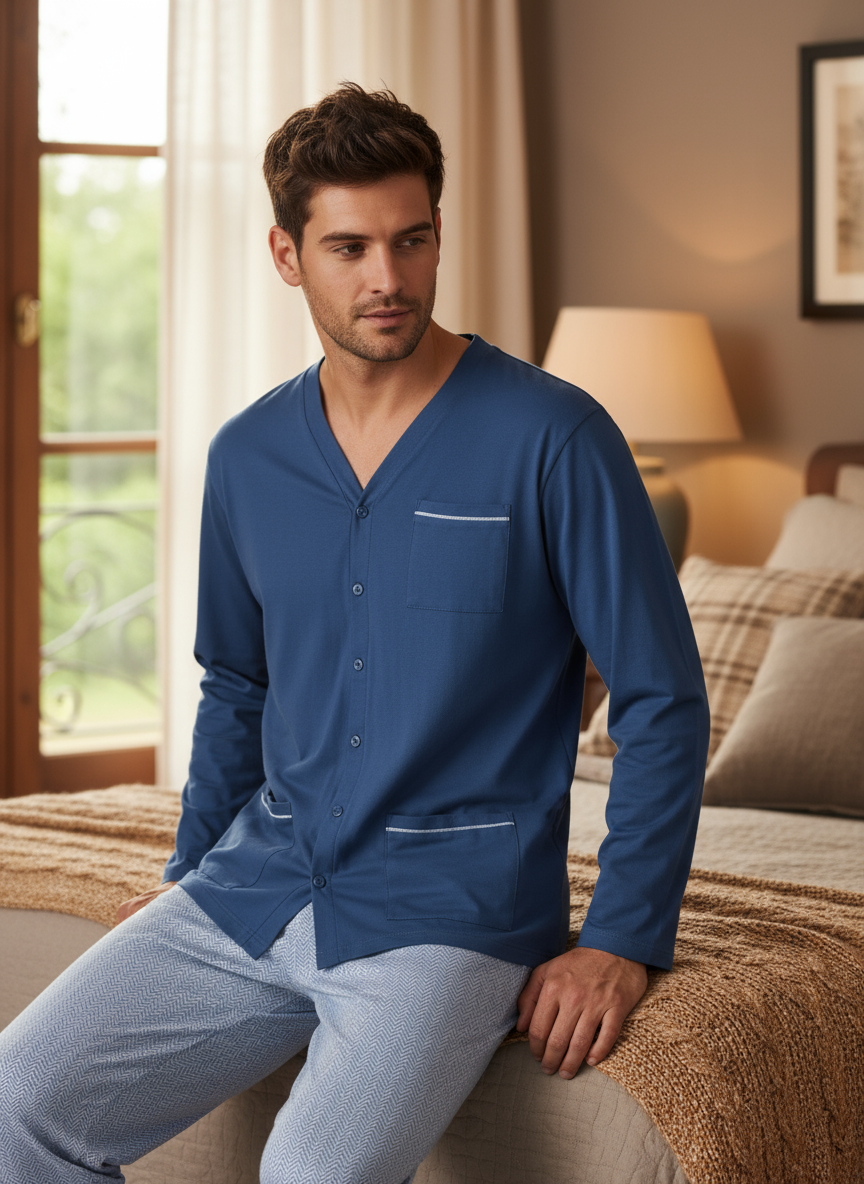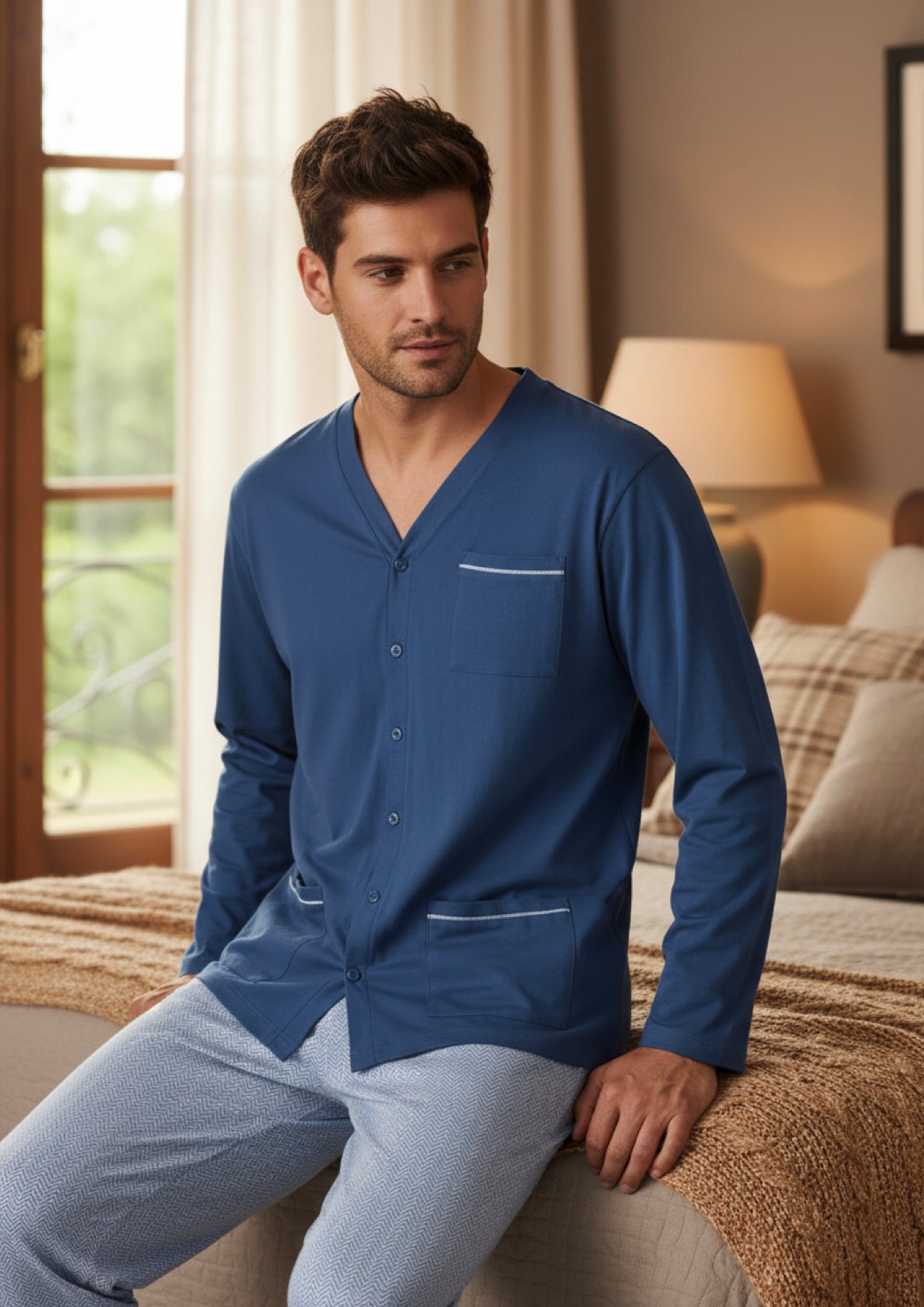 Descrizione: Pigiama da uomo manica lunga con giacca aperta 6 bottoni, pantaloni fantasia tessuto spigato senza polsini, realizzato in morbido jersey dalla vestibilità ultra comoda, che lo rendono un must-have.