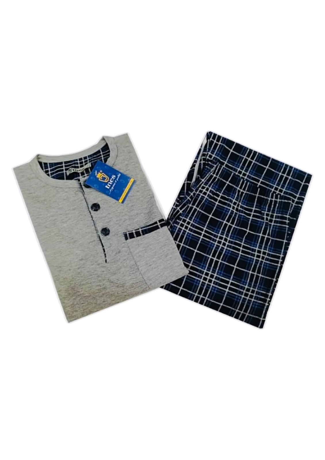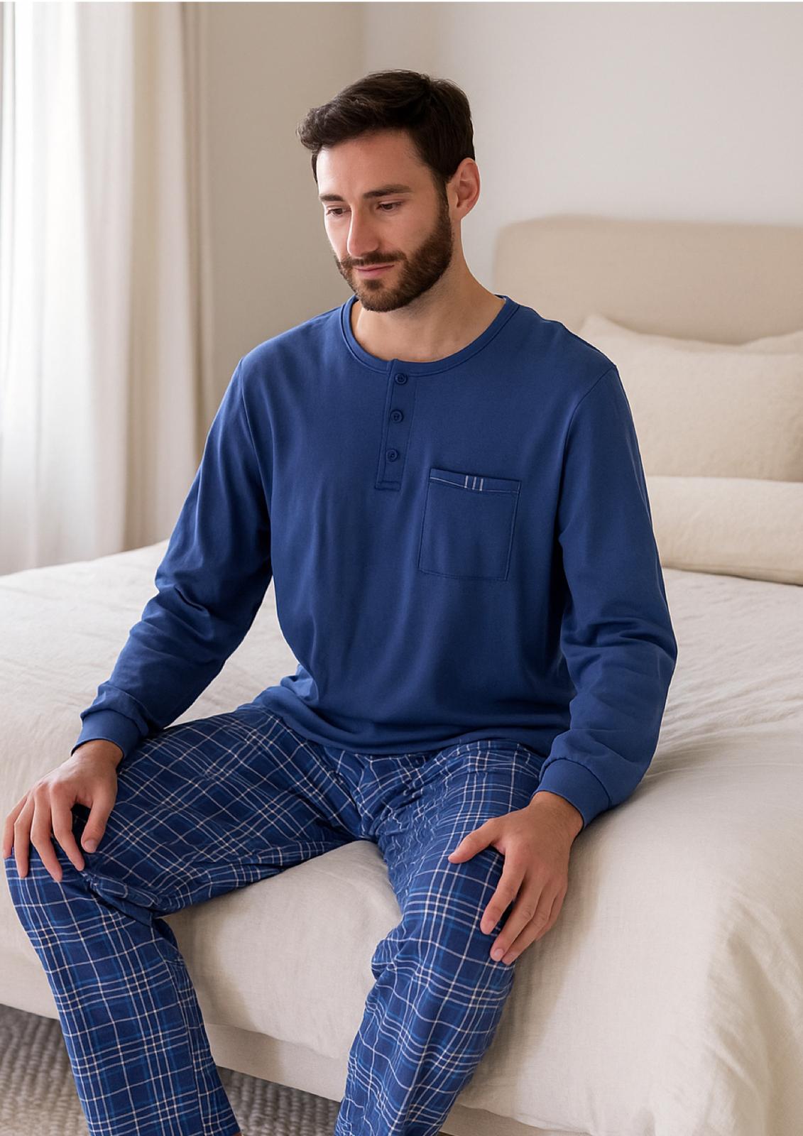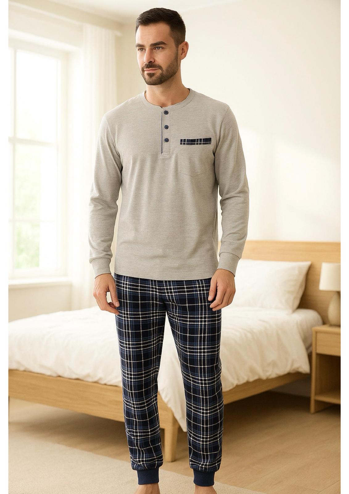 Descrizione: Pigiama Uomo Manica Lunga con Polsini, nella versione Scozzese blu, oppure grigio melange con pantalone scozzese blu.