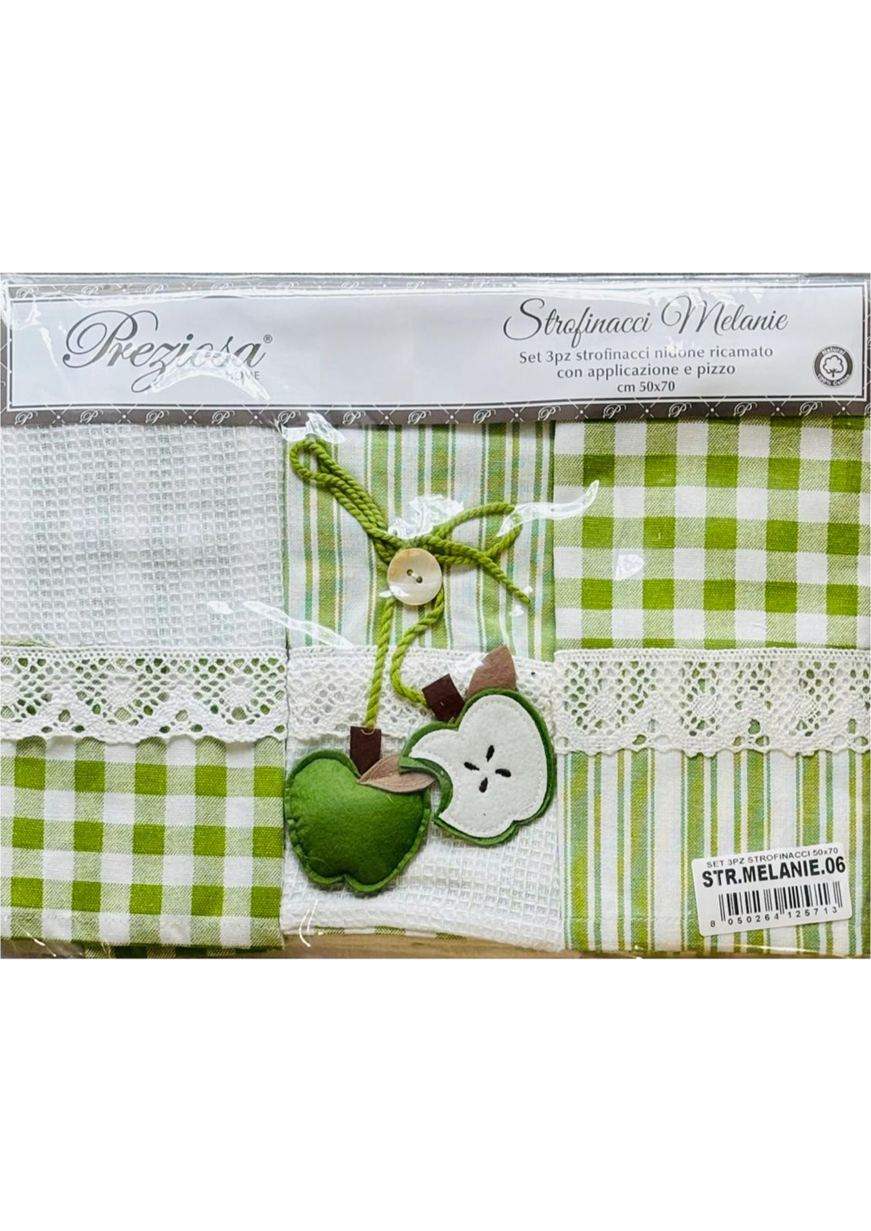 Descrizione: Set da 3 pezzi strofinacci nidone ricamato con applicazione e pizzo della PREZIOSA, linea Melanie. Misure 50x70cm