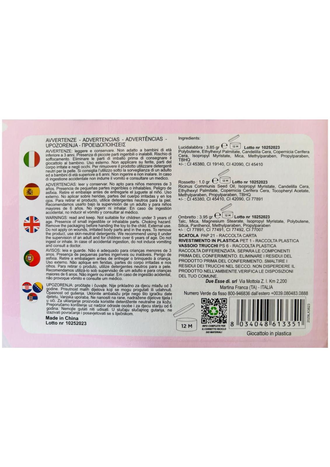Descrizione: Set make up bimba, a forma di arcobaleno colorato, composto da lucidalabbra, rossetto e ombretti. Non adatto a bambini di età inferiore a 3 anni. Si consiglia l'utilizzo a bambini di età superiore ai 6 anni.