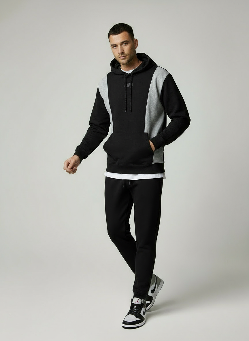 La felpa nera è arricchita da bande laterali grigio melange che ne valorizzano la linea, con logo CHARRO stampato sul petto in bianco e tasca a marsupio.