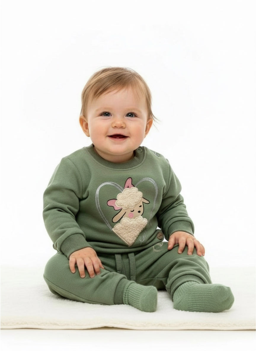 Felpa verde salvia con stampa centrale: un agnellino con cuore applicato in tessuto peluche, incorniciato da un cuore glitterato argento e dalla scritta Lovely. Girocollo, polsini e fondo in costina elastica per una vestibilità comoda. Apertura con bottoncini automatici sulla spalla, pratica per la vestizione.