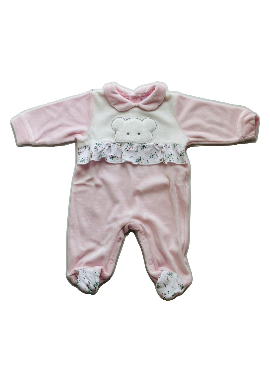 Descrizione: Tutina nascita in morbida ciniglia I BATUFFOLINI, nei toni del rosa chiaro e del bianco, con ricamo orsetto e applicazione di balza in cotone e piedini a fiorellini su fondo bianco. Comoda chiusura con bottoncini a pressione posteriori e lungo le gambe per facilitare il cambio.