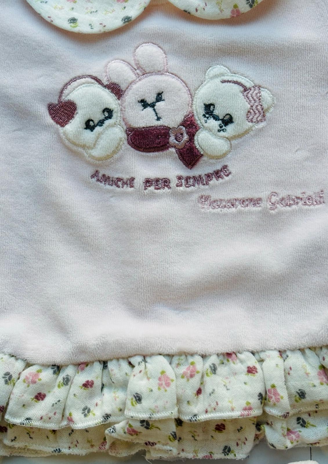 Descrizione: Completo nascita 2 pezzi in morbida ciniglia NAZARENO GABRIELLI rosa tenue, con maglia con ruches floreale su fondo bianco, colletto e piedini abbinati. Comoda chiusura con bottoncini a pressione posteriori e lungo le gambe per facilitare il cambio.