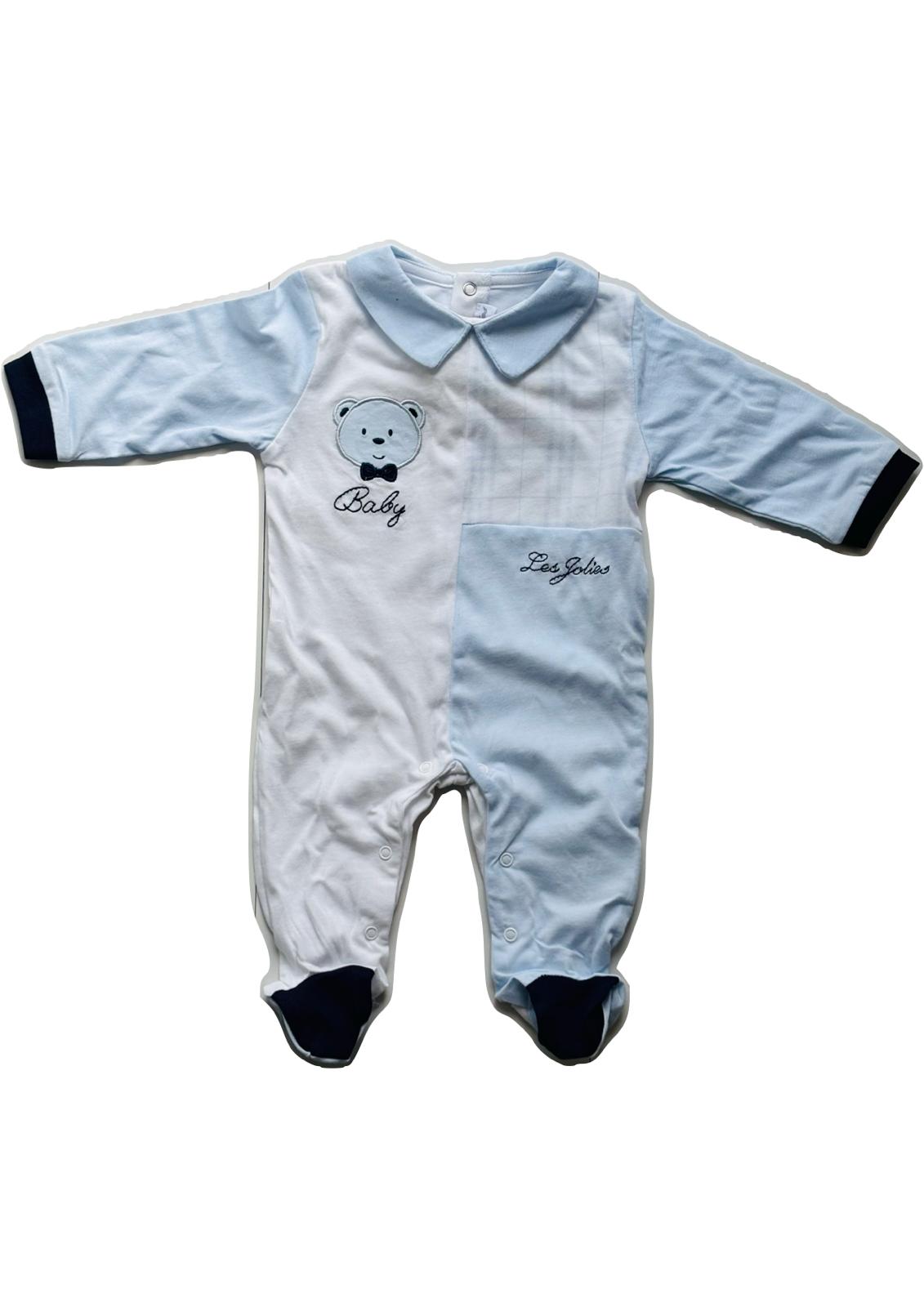 Descrizione: Tutina Neonato Jersey LES JOLIES, con stampa e ricamo orsetto, color cielo con polsini e piedini blu.